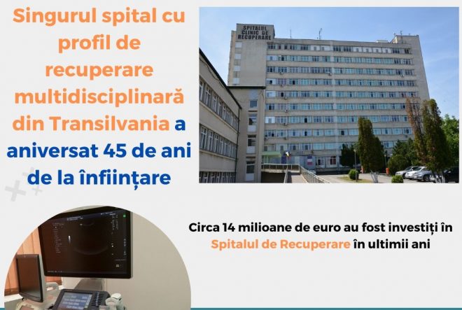 Spitalul Clinic de Recuperare din Cluj-Napoca a marcat, la finalul săptămânii trecute, împlinirea a 45 de ani de la înființare. Spitalul de recuperare este o unitate sanitară aflată sub autoritatea Consiliului Județean Cluj.