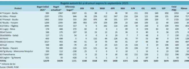 Pe de altă parte, ocupanta locului 2, Autostrada A1 Sibiu – Pitești, pentru care s-au alocat în plus 644 de milioane de lei, încă mai are buget necheltuit de peste 700 de milioane de lei, conform datelor menționate, aferente lunii septembrie 2025.