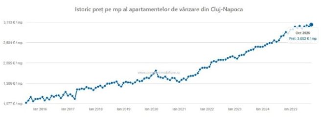 Prețul mediu al apartamentelor de vânzare din Cluj-Napoca, în octombrie 2025, a fost de 3.052 euro/mp, cu 44 euro/mp mai mult față de luna precedentă (3.008 euro/mp) și cu 272 de euro mai mult față de aceeași perioadă a anului trecut (2.780 euro/mp), conform analizei realizate la începutul acestei luni de platforma compariimobiliare.ro.