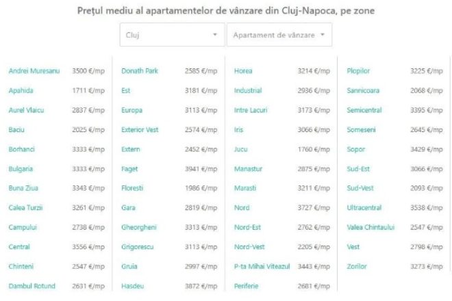 Conform analizei pe luna octombrie 2025, cele mai ieftine apartamente scoase la vânzare pe această platformă se găsesc în Apahida (1.711 €/mp), Jucu (1.760 €/mp), Florești (1.986 €/mp) și Sânnicoară (2.068 €/mp), iar cele mai scumpe sunt în Semicentral (3.395 €/mp), Sopor (3.429 €/mp), Andrei Mureșanu (3.500 €/mp), Ultracentral (3.538 €/mp), Central (3.556 €/mp), zona Nord (3.727 €/mp) și Făget (3.941 €/mp).