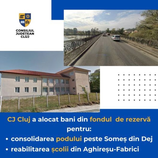 Consiliul Județean Cluj a alocat bani din fondul de rezervă pentru lucrările de consolidare a podului peste Someș din Dej. Bani suplimentari a primit și comuna Aghireșu pentru reabilitarea unei școli.
