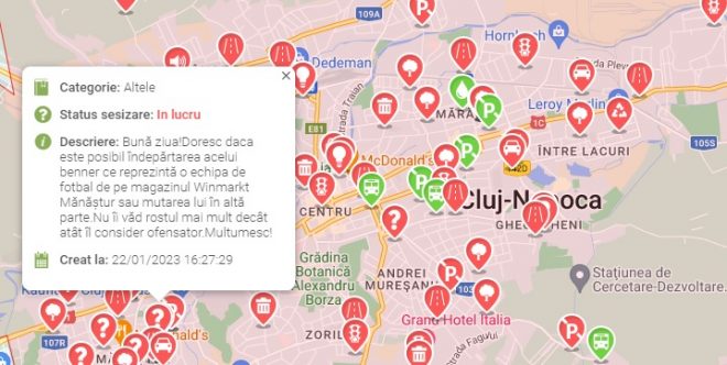 „Bună ziua! Doresc daca este posibil îndepărtarea acelui benner ce reprezintă o echipa de fotbal de pe magazinul Winmarkt Mănăștur sau mutarea lui în altă parte. Nu îi văd rostul mai mult decât atât îl consider ofensator. Multumesc!”.
