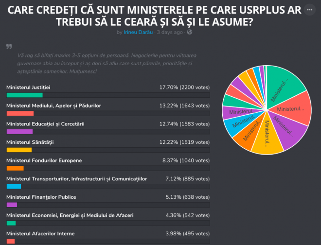 La București se negociază pe ministere. Între timp, unul dintre contestatarii lui Dan Barna, brașoveanul Irineu Darău, a lansat un chestionar online. “Care credeți că sunt ministerele pe care USR PLUS ar trebui să le ceară și să și le asume?”, i-a întrebat Darău pe USR-iști (AICI). Până la ora publicării acestui articol erau peste 12.000 de opțiuni exprimate din partea a 2773 de votanți. Fiecare a putut alege cel mult cinci ministere.