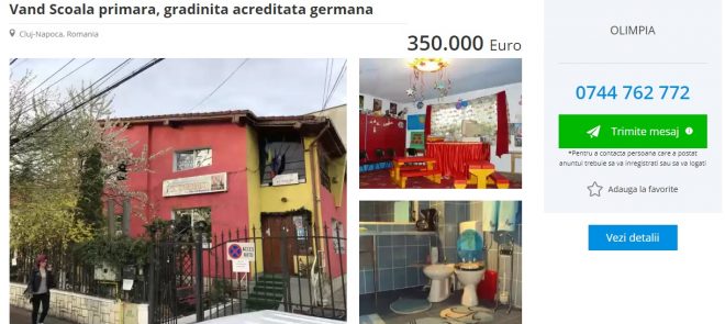 Este vorba despre un anunț care a fost postat pe o platformă care intermediază vânzări. Proprietarul acestui imobil, în fapt o doamnă din Cluj-Napoca, anunță că dorește să vândă școala primară pe care a clădit-o începând din 2002, despre care susține că este singura unitate de învățământ privat acreditată în limba germană maternă din oraș.