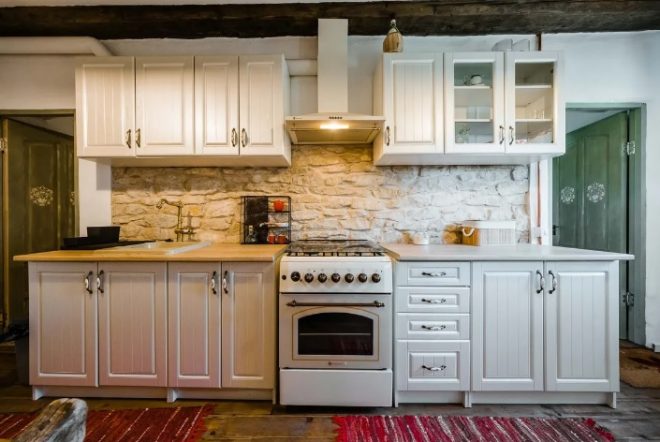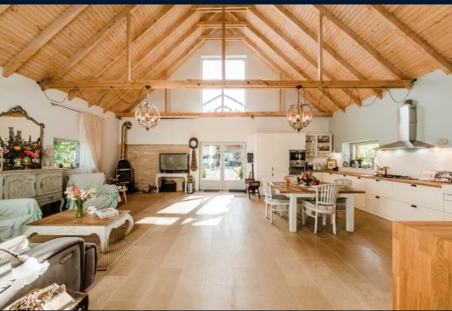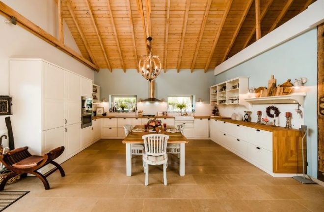 Bucătăria în stil rustic este completată de tocurile din lemn antichizat și de acoperișul din lemn. Pentru camera de zi, spațiu aflat vis-à-vis de bucătăria deschisă, se optează pentru un mobilier confortabil și pentru finisaje cu piatră și tapet. Dormitorul este luminos, iar cele două băi ale locuinței sunt impresionante ca design și calitate. Mansarda ocupă doar o porțiune a construcției și este amenajată ca dormitor.