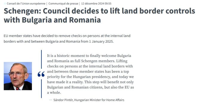 „Este un moment istoric să primim în sfârșit Bulgaria și România ca membri cu drepturi depline ai spațiului Schengen. Eliminarea controalelor persoanelor la frontierele terestre interne cu și între aceste state membre a fost o prioritate absolută pentru președinția maghiară, iar astăzi am transformat-o în realitate. Acest pas va fi benefic nu numai pentru cetățenii bulgari și români, ci și pentru UE în ansamblu”, a spus Sándor Pintér, ministrul ungar al afacerilor interne.