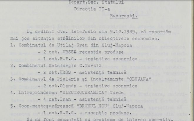 Securitatea Cluj informa, la rândul său, în 19 decembrie 1989, cu trei zile înainte de căderea regimului ceaușist, despre situația cetățenilor străini din județ.