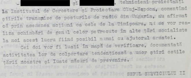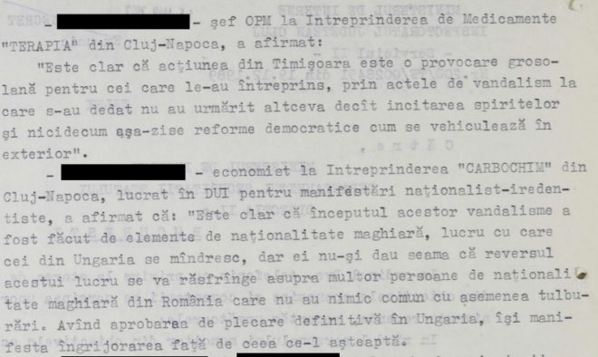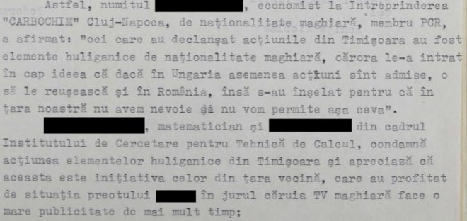 „Cu privire la evenimentele petrecute la Timișoara, majoritatea celor semnalați de rețeaua informativă condamnă faptele și atitudinea huliganică a celor care le-au inițiat, apreciind că acestea au fost dirijate de elemente extremiste maghiare din exterior, care au profitat de conjunctura creată în jurul pastorului (László Tőkés – n.r.).