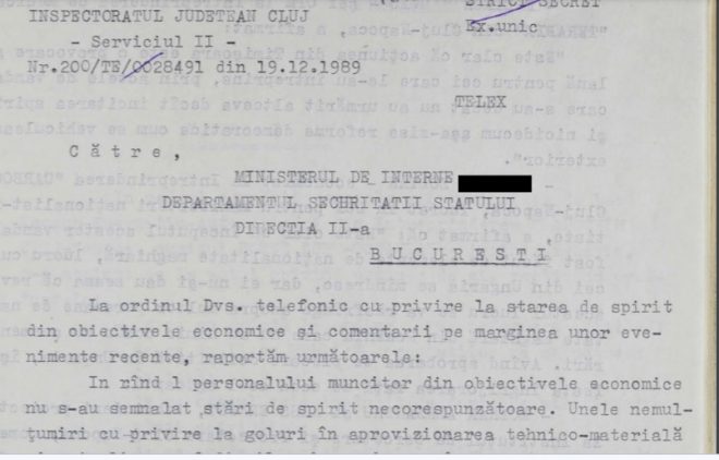 În 19 decembrie 1989, Securitatea din Cluj informa DSS (foto facsimil) că „în rândul personalului muncitor din obiectivele economice nu s-au înregistrat stări de spirit necorespunzătoare” ci doar „unele nemulțumiri cu privire la goluri în aprovizionarea tehnico-materială” la Întreprinderea „Someșul”.