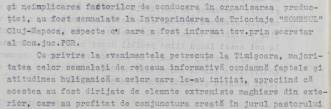 Mai mult, în contextul evenimentelor de la Timișoara, Securitatea din Cluj dădea vina pe „elemente extremiste maghiare din exterior” și pe „huliganii” care au ieșit pe străzi.