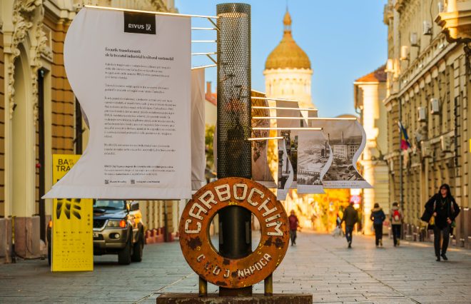 Instalația vorbește despre drumul lung al locului — de la înființarea fabricii Carbochim, în 1949, la schimbările industriale și, în final, la renașterea urbană prin proiectul RIVUS. „Este în același timp umbre trecutului cu lumina unor noi începuturi”, se precizează pe panou.