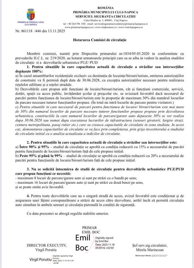 Media9 a obținut în exclusivitate Hotărârea Comisiei de circulație care stabilește regulile după care vor fi analizate proiectele imobiliare amplasate pe străzi sau intersecții saturate de trafic. Documentul este redactat în 13 noiembrie, chiar în ziua când primarul anunțase măsurile în comisia de urbanism, și semnat digital de primarul Emil Boc în 18 noiembrie.