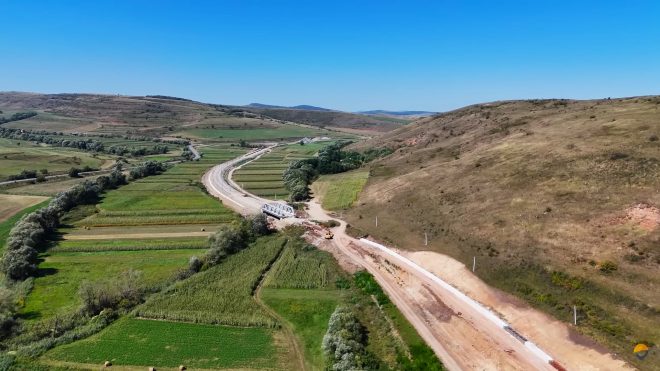 Aghireș-Poieni a trecut de 50% în teren, fiind cel mai avansat, dar progresul din august față de iulie e de un singur punct procentual. Linia traversează dealurile Căpușului pe un traseu sinuos, ajunge la cea mai mare altitudine, aproximativ 550 metri în zona tunelului Stana, apoi coboară spre Huedin. Activitatea este firavă, vedem doar vreo 7 locuri în care se muncește.