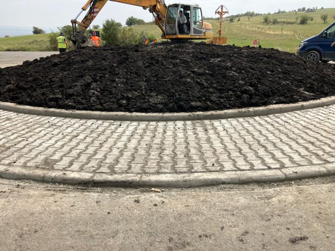 De asemenea, au fost montate borduri pe marginile interioare și exterioare ale pavajului carosabil și a fost amenajată zona centrală a sensului giratoriu cu pământ, folie hidroizolantă și pământ care a fost însămânțat cu iarbă de gazon.