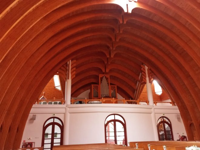 Biserica despre care vorbim are o înălțime de 13,5 metri de la sol la vârf. Cupola interioară este realizată din foarte multe arce din lemn de molid, arce care îți dau senzația unui torace imens. Prima impresie, cea pe care a avut-o și autorul acestui articol, ar fi că arată ca interiorul unei balene. Sau precum Arca lui Noe.