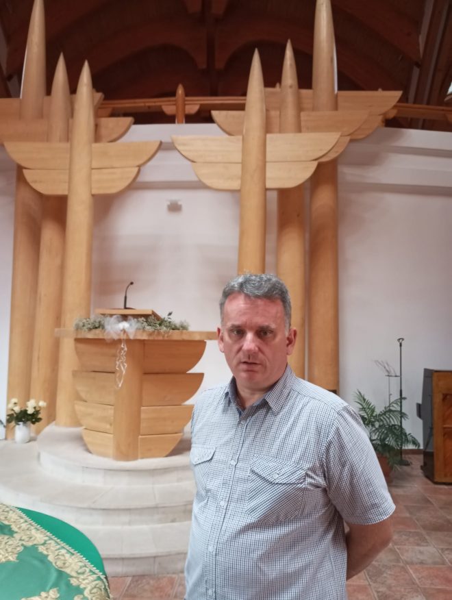 „Biserica noastră are o arhitectură organică, ceea ce înseamnă că la baza filosofiei arhitectului stă antroposofia. Imre Makovecz a văzut ce se întâmpla în orașe, prin anii ’70 – ’80. Că oamenii sunt puși să locuiască în niște ‘cutii’, zicea el despre blocuri. Iar copacii de la marginea orașelor au ‘încremenit’. Ei, din acești copaci, a răsărit o biserică”, a explicat preotul Bibza Gabor