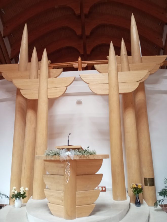 Amvonul este realizat din șase stâlpi uriași (foto jos), de vreo 4-5 metri înălțime, toți din lemn, care în vârful lor imaginează aripile unor îngeri.