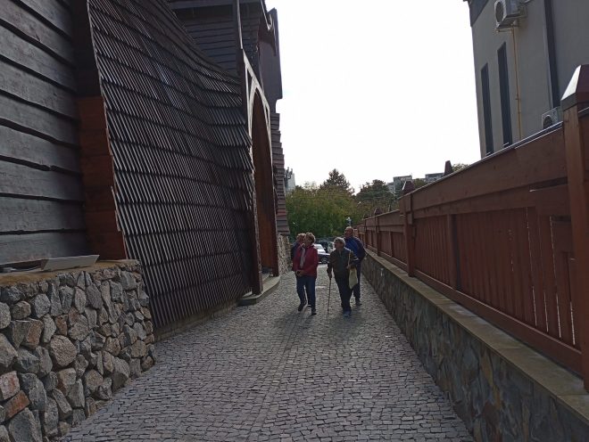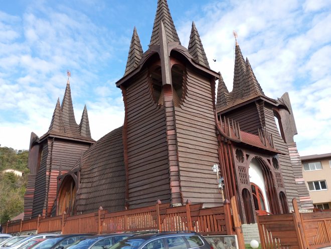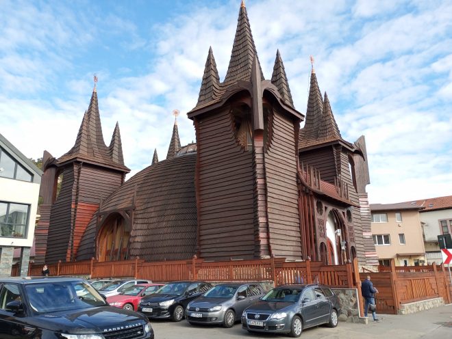 Pare cel puțin ciudată arhitectura acestei clădiri din cartierul Grigorescu. Sau dacă nu ciudată, atunci inedită. Cu rotunjimi plăcute și turnuri amplasate după anumite reguli arhitecturale, care nu deranjează ochiului. Și cu mult lemn, chiar foarte mult. Doar structura de bază este din beton, restul clădirii, corpul, interiorul și acoperișul, fiind din lemn.