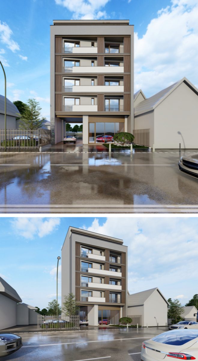 - Corp C1 (P+4E+Etaj retras) – amplasat la frontul străzii Traian Vuia, va include un showroom auto la parter și un mic hotel la etaje, cu 12 camere de cazare turistică. Hotelul ar urma să funcționeze pe un sistem modern de self check-in/check-out.