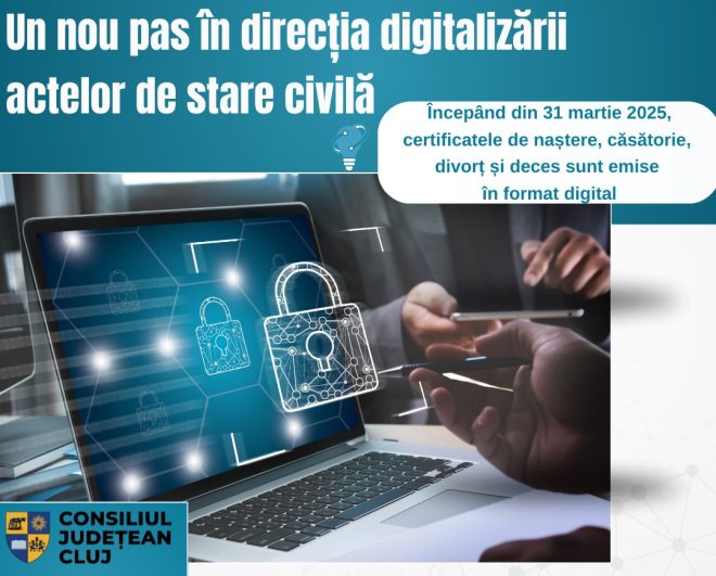 Potrivit CJ Cluj, de luni, 31 martie 2025, înregistrarea acestor evenimente se va realiza exclusiv în format digital, informațiile vor fi completate în format electronic de către ofițerii de stare civilă, iar eliberarea certificatelor de stare civilă se va face în format digital sau, la cerere, în format fizic printat pe un formular tipizat securizat de stare civilă.