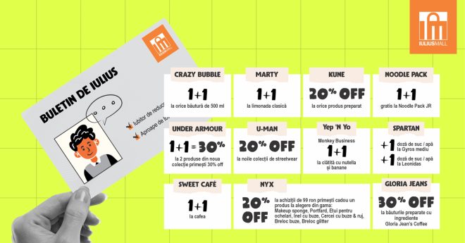 Under Armour oferă 30% reducere la 2 produse din colecția nouă, U-MAN, KUNE vin cu promoții de 20%, NYX are 20% reducere la achiziții de 99 de lei, Crazy Bubble, Marty, Noodle Pack și Yep ‘N Yo te tentează cu oferte 1+1 la diverse preparate delicioase, iar Spartan are două promoții speciale. Toate ofertele sunt disponibile exclusiv pe „buletinul de Iulius”, iar dacă le bifezi pe toate, primești și un voucher de parcare.