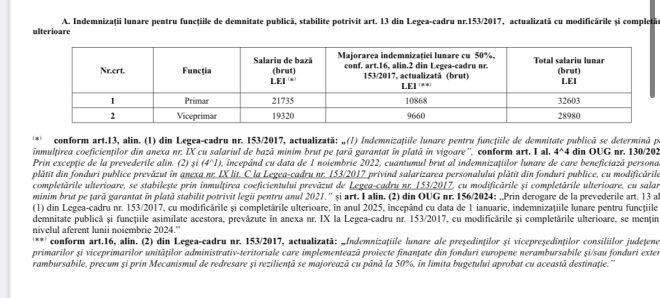 - Primar: 21.735 lei + majorare 50% pentru proiecte europene (10.868 lei) = 32.603 lei/lună