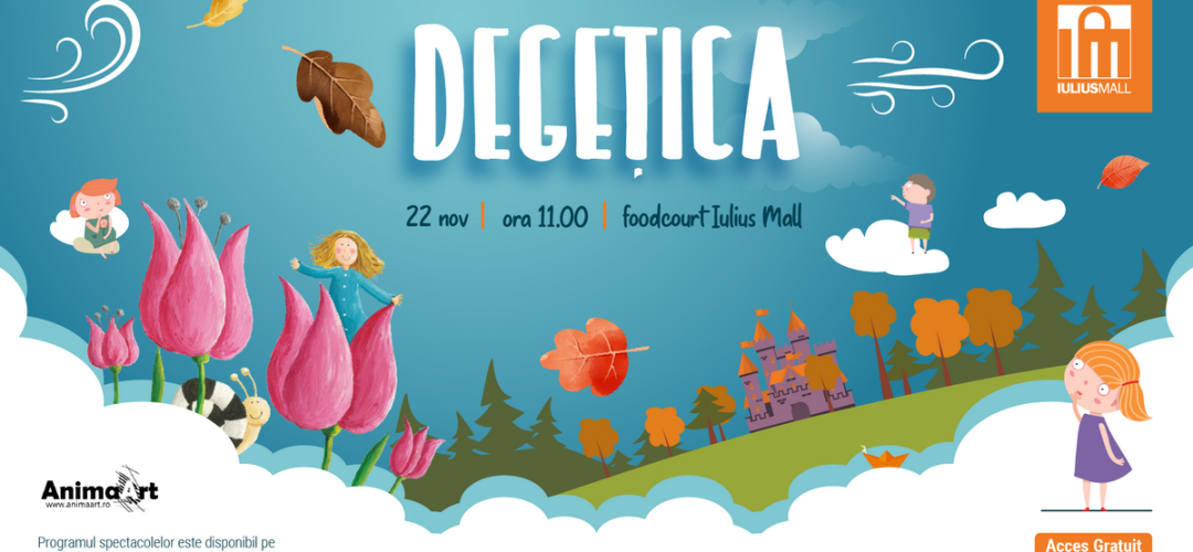 Povestea fetiței care s-a născut într-o floare, a fost salvată de peștișori și care a devenit Zâna Florilor îi va încânta pe cei mici. „Degețica” va urca pe scena din food court sâmbătă, începând cu ora 11.00. Intrarea este gratuită pentru toți curioșii. Teatrul de păpuși este interactiv, iar micii spectatori vor putea interacționa cu simpaticele marionete.