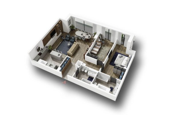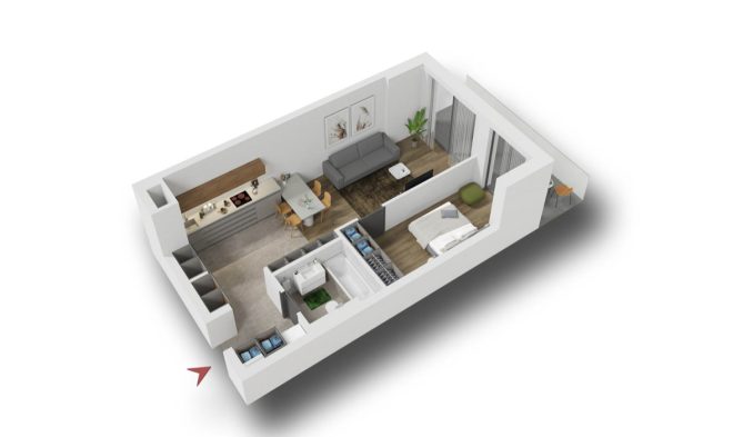 În total, sunt disponibile 14 tipologii de apartamente, de la unități de două camere până la penthouse-uri. Designul interior pune accent pe funcționalitate și calitate. De exemplu: