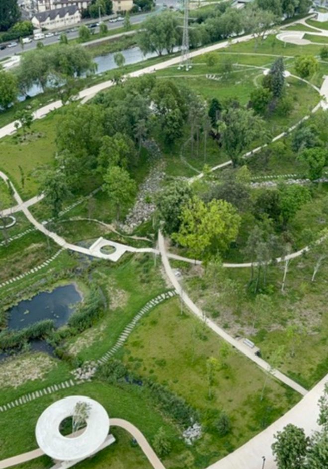 Construcția e într-un stadiu avansat, iar vizita pe șantier s-a transformat, inevitabil, într-un exercițiu de privire panoramică. De pe terasa nordică vezi Parcul Feroviarilor în toată lungimea sa, Someșul desenând liniștit conturul zonei, cartierele din apropiere și, departe, Livada Steluța. Înspre sud, spectacolul vizual e urban și dens: acoperișurile zonei centrale, turlele celor mai importante biserici din oraș – toate cultele sunt prezente –, dar și clădiri istorice remarcabile care dau caracter Clujului.