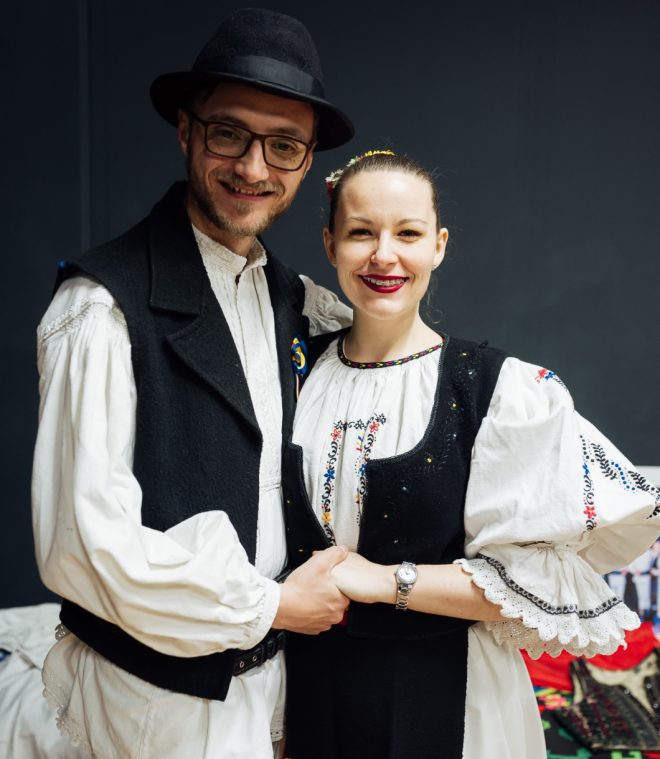 Alexandra și Andrei Mezdrea (foto jos) au dus pasiunea lor pentru folclor la un alt nivel. După mai mult de 20 de ani de activitate ca dansatori, au urmat cursuri coregrafice la Academia Națională de Muzică „Gheorghe Dima”, iar în 2019 au fondat Școala de dans tradițional „Dor de Joc” din Cluj.