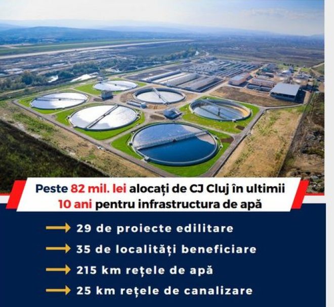 Astfel, în ultimii 10 ani Consiliul Județean Cluj a finanțat cu peste 82.000.000 de lei nu mai puțin de 29 de proiecte de alimentare cu apă potabilă și canalizare din 35 de localități clujene.