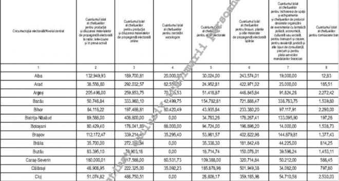 Restul sumelor sunt mult mai mici: 51.000 pentru propagandă radio-TV, 28.800 pentru afișe, 54.700 pentru protocol, închirieri de spații și plata mandatarului finaciar. În fine, 2.500 de lei sunt comisionale bancare.