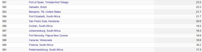 Pe de altă parte, cele mai periculoase orașe din lume sunt din Africa de Sud (cinci), unul din Statele Unite (Memphis), iar restul din America de Sud și Centrală.