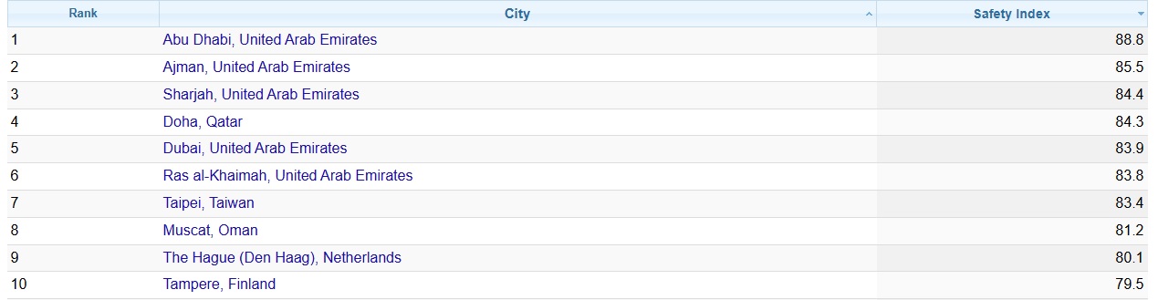 Foarte interesant este faptul că în TOP 10 cele mai sigure orașe din lume, șapte sunt din state arabe; două orașe din acest clasament sunt din Europa (Haga și Tampere), iar unul din Asia (Taiwan).