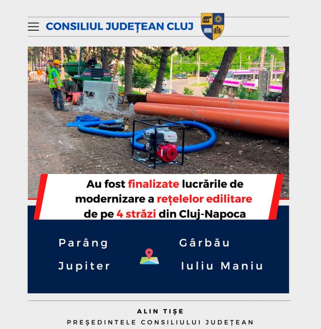 Au fost finalizate lucrările de reabilitare a conductelor de apă și canalizare de pe străzile Parâng, Gârbău, Jupiter și Iuliu Maniu, anunță CJ Cluj.
