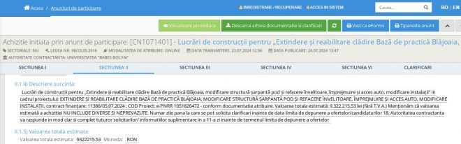 „Lucrări de construcții pentru „Extindere și reabilitare clădire Bază de practică Blăjoaia, modificare structură șarpantă pod și refacere învelitoare, împrejmuire și acces auto, modificare instalații” conform documentatie de atribuire Valoarea totala estimată: 9.322.215,53 lei (fără T.V.A.) Menționăm că valoarea estimată a achizitiei NU INCLUDE DIVERSE SI NEPREVAZUTE”.