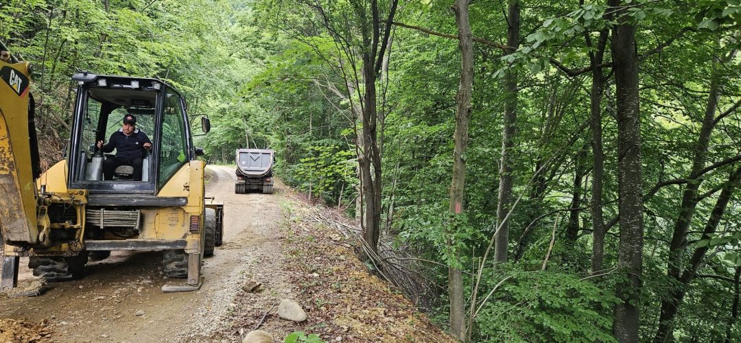 Lucrări de întreținere pe un drum județean care străbate o zonă montană extrem de pitorească