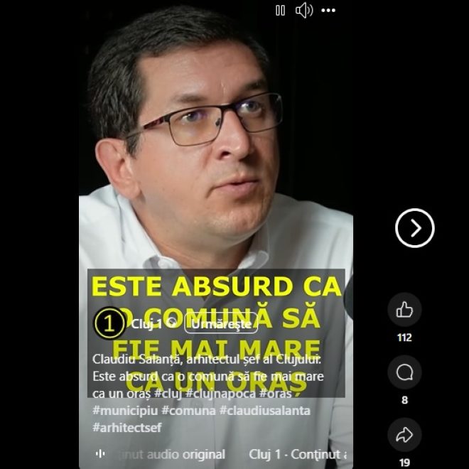 Să spună: avem 7 comune, că nu e doar Clujul, se întâmplă și în județul Timiș (comuna Dumbrăvița, lipită de municipiul Timișoara – n.r.), în Sibiu (comuna Șelimbăr – n.r.), în județul Iași (comuna Miroslava, lângă municipiul Iași – n.r.). Ideea este că, în momentul în care ai peste 10.000 de locuitori, nu mai poți să te chemi comună”, a declarat arhitectul-șef al Clujului, Claudiu Salanță, la podcastul Cluj1.